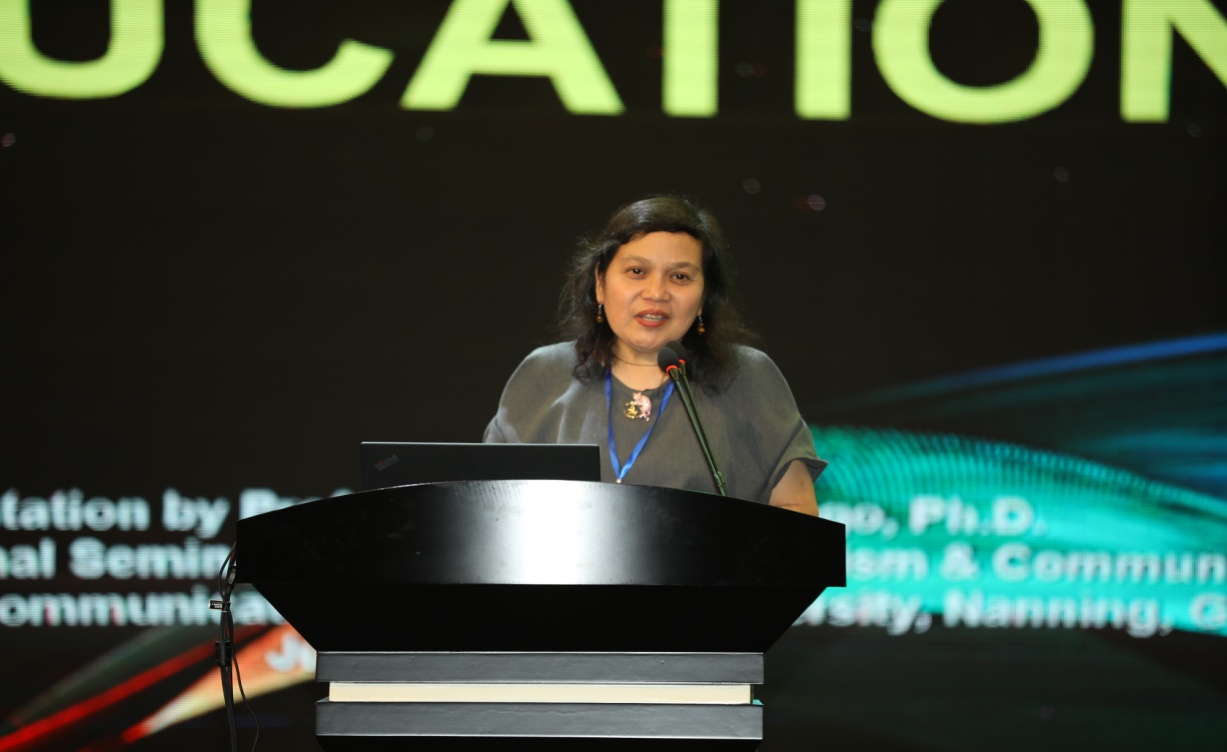 菲律宾大学大众传播学院院长 Arminda Vallejo Santiago(阿曼达·瓦莱乔·圣地亚哥)在简要介绍了菲律宾媒体发展的历史后,着重探讨了第四次工业革命和数字时代下技术的快速发展,如何给菲律宾新闻教育带来挑战。