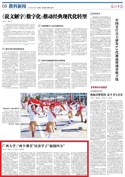 “实践是学以致用的最佳途径。教育不仅要在课堂育人,更要在广阔天地间育人,让学子学有所成,让教育遍地开花。”学院党委副书记银健告诉记者,近年来,学院以部校共建为契机,保障学生实战有器材、实践有平台,积极开展校媒协同,成立了广西新媒体实验室,致力于让理论与实践实现无缝对接。一批学生作品在全国竞赛中斩获大奖,一批学子走上新闻岗位即成为骨干,学院也因此入选2019年教育部“三全育人”综合改革试点院(系)。