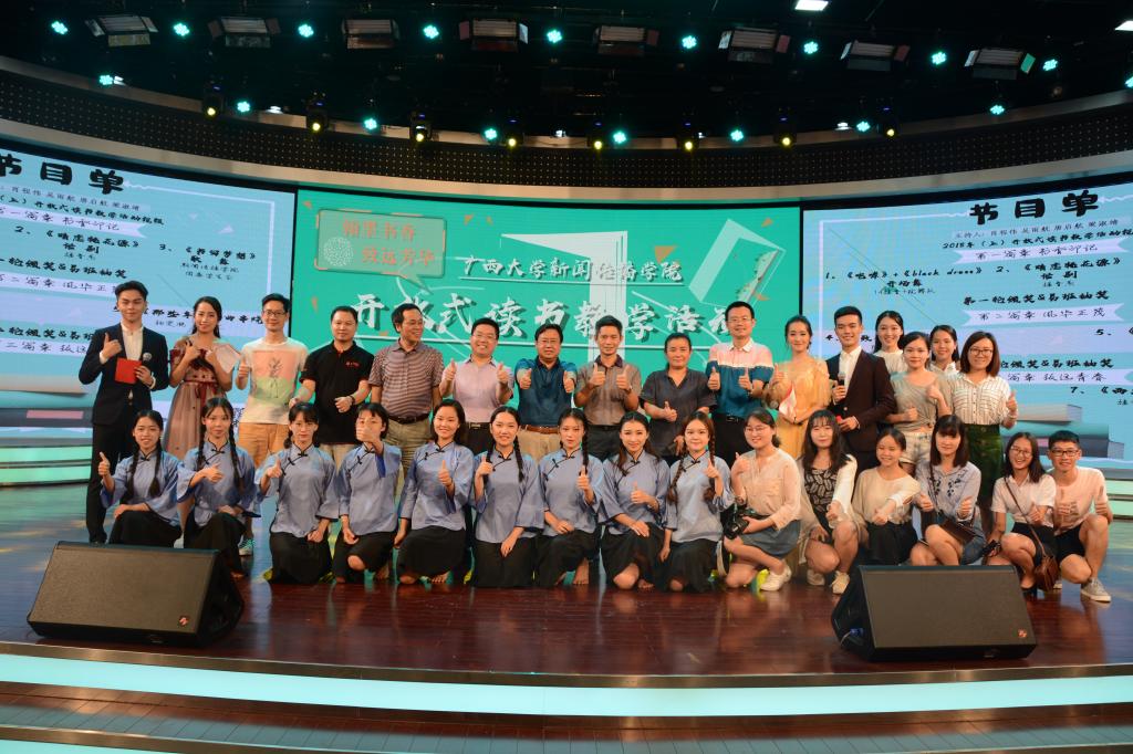 6月19日晚,太阳成集团tyc7111cc新闻传播学院开放式读书教学活动第八届“翰墨书香、致远芳华”读书晚会在融媒体中心精彩上演。自治区党委宣传部新闻协调小组组长潘云锋,自治区远程办教学资源处副处长蒙杰,校团委书记左向蕾,学院党委书记唐兴,学院党委副书记曾海艳,副院长银健,副院长吴海荣以及200余名师生代表观看了此次晚会。