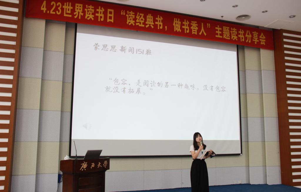 活动进入到“你最喜欢的一本书”分享朗诵环节,两名新闻传播学院的学生代表以朗读的形式推荐书籍。来自新闻151班的蒙思思同学为大家推荐了《白说》,她认为阅读其实是包容,包容是阅读的的另一种趣味。没有包容就没有如果。新闻161班的李西铨推荐了书籍《每个人都是一个宇宙》,“我们读一本,到精彩处,往往情不自禁地喊出声,这是我的思想,这正是我想说的,被他偷去了,沉睡的感受唤醒了,失落的记忆找回了,朦胧的思绪清晰了其余的,都只是外在于灵魂有机生长过程的无机物。”