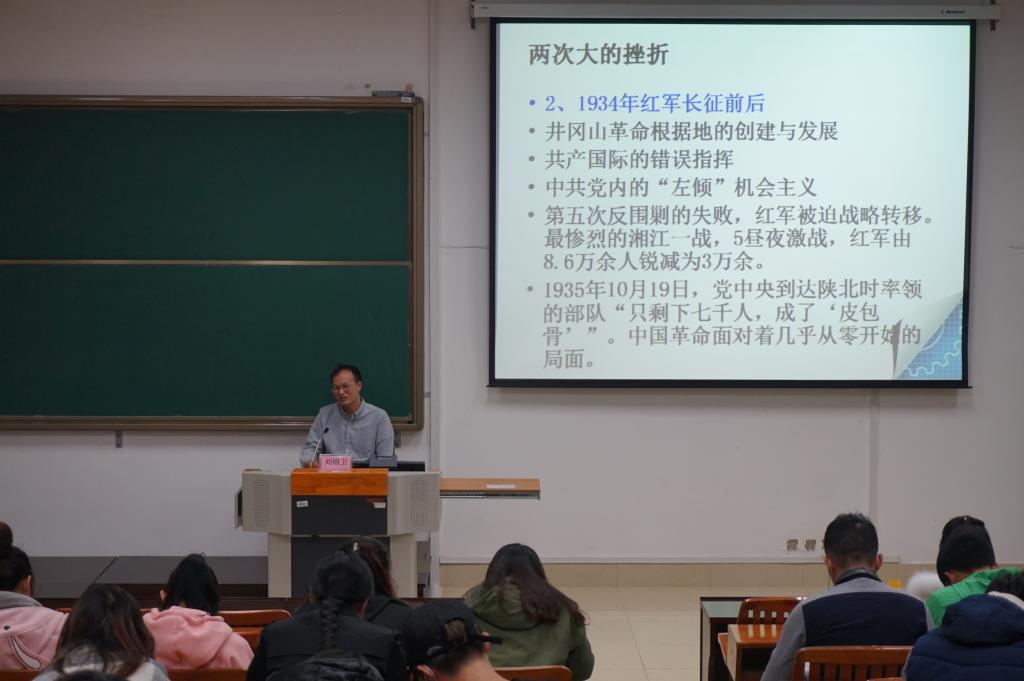 12月16日下午,太阳成集团tyc7111cc新闻传播学院西报告厅又迎来了一场国情教育课。此次邀请的是广西壮族自治区党委党史研究室征研一处处长、研究员刘绍卫,他为同学们介绍了中国共产党的历史,梳理了中国共产党自诞生至今所作出的重要贡献、经历的艰难困苦和重大转折点,并指出了后人从这些历史中所获得的启示。