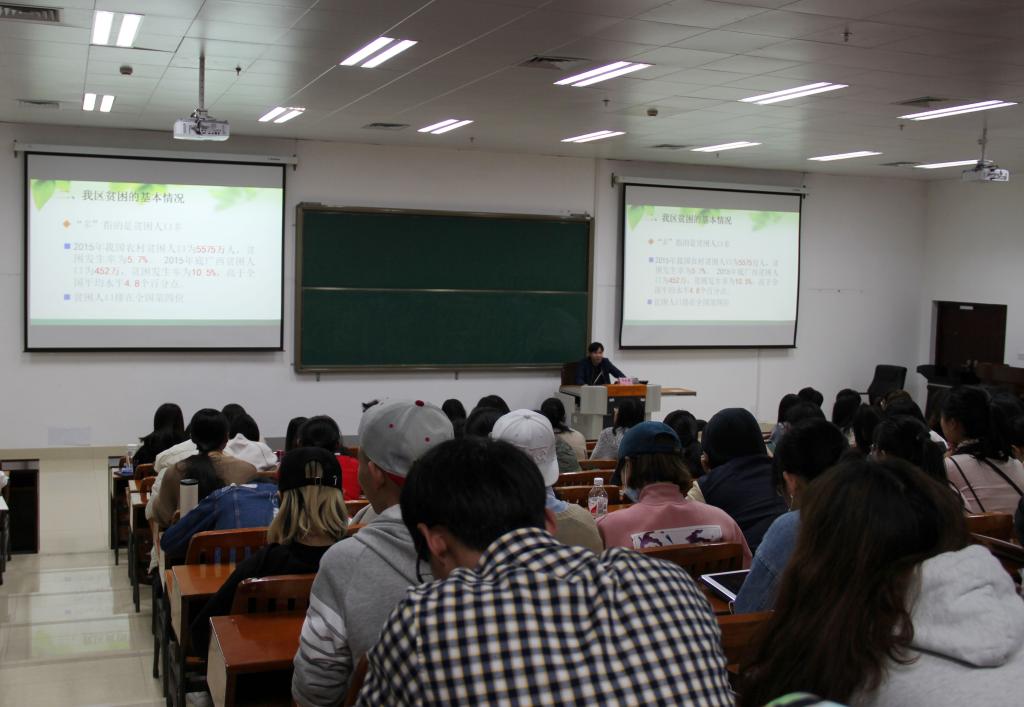 韦永喜处长精彩的授课,让现场同学对准扶贫精准脱贫有了更加深刻的认识。“我的家人就有在广西当公务员的,看他们经常为了做好扶贫工作东奔西走,当时的我并不是很理解。”新闻141班的苏悦婧说。听了这次讲座,苏悦婧了解了广西扶贫工作的基本情况,也终于明白扶贫工作的不易。“希望我今后不论在哪个行业都要努力工作,为扶贫贡献自己的力量。”